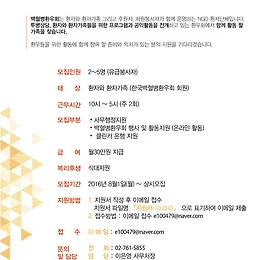 봉사자 썸네일형 리스트형 서.둘.토 마지막 걸음, 같이 걸어요! 드디어 서둘토의 마지막 코스입니다. 그동안 서울둘레길 8개 코스를 백혈병환우회와 함께 걸어준 모든 분들께 감사드립니다. 이번에는 마지막 코스를 걸은 후, 완주 증명서 발급 및 완주를 축하하는 자리를 가지려 합니다^^ 많은 참여 부탁드립니다 ^ㅡ^ 서둘토와 함께 동행은 못하시지만 서둘토 완주를 축하해주실 분들은 도봉산역 2번출구 앞 창포원 입구에 3시까지 오시면 됩니다. 오셔서 같이 축하해주세요^^ 일시 : 11월 12일 토요일 오전 10시 장소 : 지하철 4호선 수유역 3번 출구 버스로 이동 - 120,153/우이동 성원아파트 하차 더보기 한국백혈병환우회 기금마련 '일일카페'에 초대합니다. 한국백혈병환우회 기금마련 '일일카페'에 초대합니다. 한국백혈병환우회 활동기금마련 '일일카페'를 진행하고자 합니다. 오셔서 맛있는 음식도 드시고, 환우회도 응원해주세요^^ 일시 : 2016년 11월 19일 (토) 오후 3시~9시 장소 : 공상카페 (9호선 선정릉역 2번 출구 도보 3분 거리) 더보기 서울둘레길 토요일 걷기 10번째 서.둘.토, 가양역에서 증산역까지 다녀왔습니다. 2016년 9월 24일 토요일, 7코스 봉산 ·앵봉산 코스를 다녀왔습니다^^ 이번 코스는 평지길로 이루어진 비교적 걷기 쉬운 코스로, 서둘토의 자연을 한껏 느끼며 걸을 수 있었습니다. 더보기 서둘토 9번째 걸음, 관악산코스를 다녀왔습니다. 2016년 8월 20일 토요일, 서둘토에서는 5코스인 관악산코스를 다녀왔습니다. 무더운 여름날씨에도 서둘토의 식구들은 끄덕없습니다~ 4계절은 서둘토와 함께~ 여름도 함께해요^^ 더보기 백혈병환우회에서 함께 일 할 가족(봉사자)을 찾습니다. 백혈병환우회는 환자와 환자가족 그리고 후원자, 자원봉사자가 함께 운영하는 NGO 환자단체입니다. 투병상담, 환자와 환자가족들을 위한 프로그램과 공익활동을 전개하고 있는 환우회에서 함께 활동 할 가족을 찾습니다. 환우들을 위한 활동에 함께 참여 할 준비와 의지가 있는 분의 지원을 기다리겠습니다. 더보기 이전 1 다음