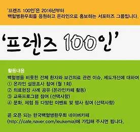 프렌즈100인 썸네일형 리스트형 봄비와 함께한 4월 정기모임 울타리^^ [울타리 4월 정기모임] 봄비와 함께한 4월의 정기모임 울타리가 카페 사이시옷에서 진행되었습니다. 이번 울타리는 새로운 프로그램과 함께 하였습니다. 15분간 나의 완치 노하우를 들려주는 시간^^ 유익한 정보들이 가득하였습니다. 더보기 울타리 3월 정기모임에 다녀왔습니다. 울타리 3월 정기모임에 다녀왔습니다.서로서로 이야기하고 들어주는 가슴 따뜻한 시간을 가졌습니다.'서로가 생명의 버팀목이 되어 함께'라는 우리의 슬로건이 생각나는 시간이었습니다. 더보기 [후기] 프렌즈100인 백혈병환우회의 새로운 서포터즈! '프렌즈 100인' 발족식 및 서울 모임이 있었습니다. 훈훈하고 즐거웠던 그날을 다시 돌아보았습니다. 더보기 프렌즈100인 '프렌즈100인'이 2월20일 카페 무라노에서 진행되었습니다^^ 더보기 '프렌즈100인'에 초대합니다. '프렌즈 100인'은 2016년부터 새롭게 만들어지는 한국백혈병환우회 서포터즈 그룹입니다. 백혈병환우회를 응원하고 홍보하는 활동을 온라인을 중심으로 전개할 예정입니다. 더보기 이전 1 다음